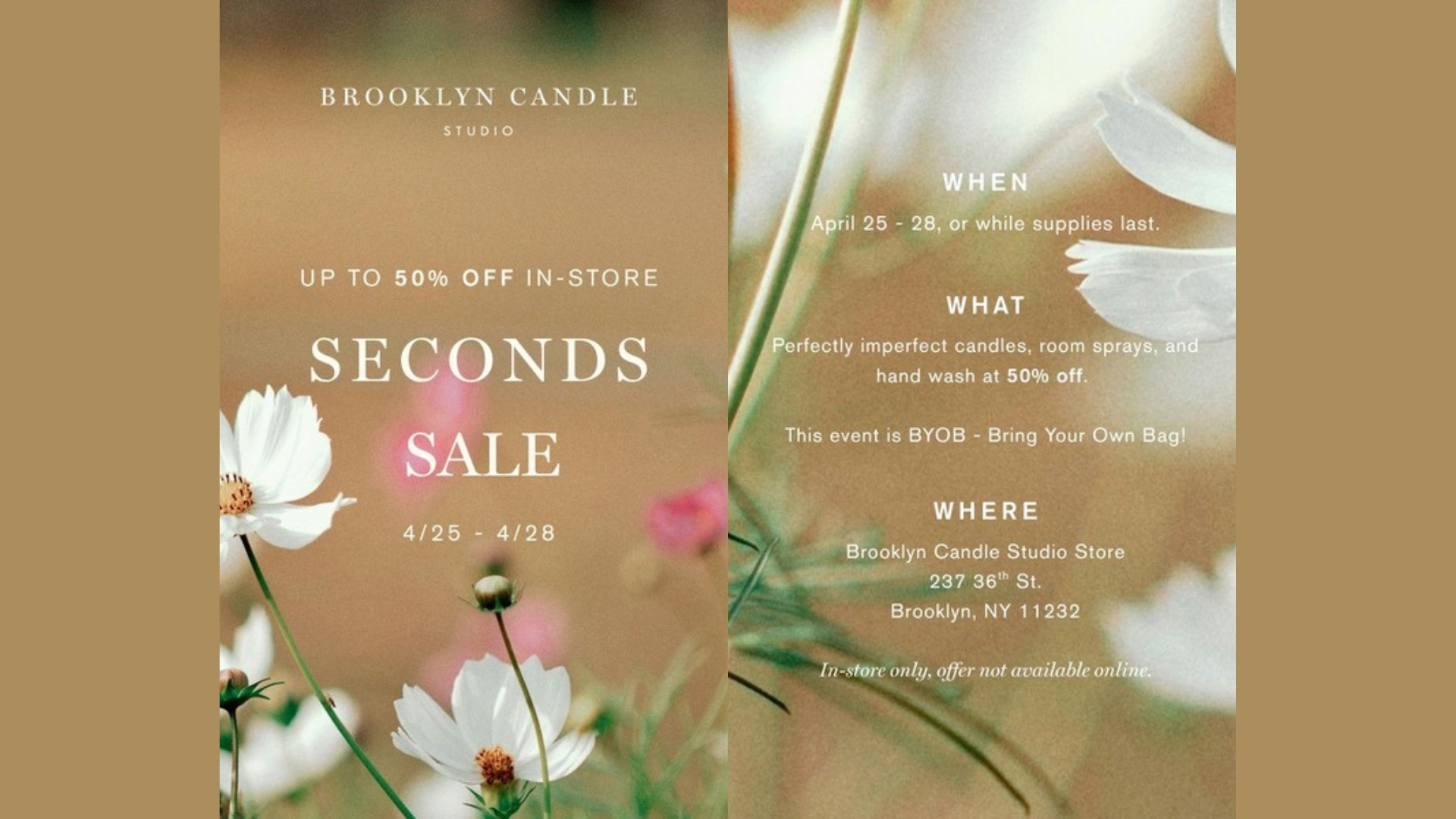 Brooklyn Candle Studio is hosting their very first in-store Seconds Sale! From April 25-28, shop perfectly imperfect candles at special prices: misprints, minor damage, and limited pours of past scents in new vessels. BYOB – Bring Your Own Bag! ♻️