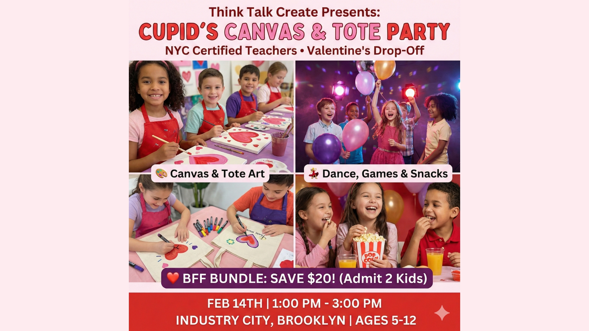 Think Talk Create returns to Industry City for a special pop-up event at The Living Room. Drop your kids off for 2 hours of creative fun while you enjoy a Valentine’s lunch, a drink, or just some quiet time at Industry City.